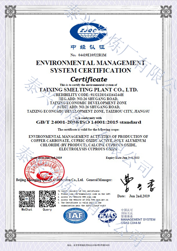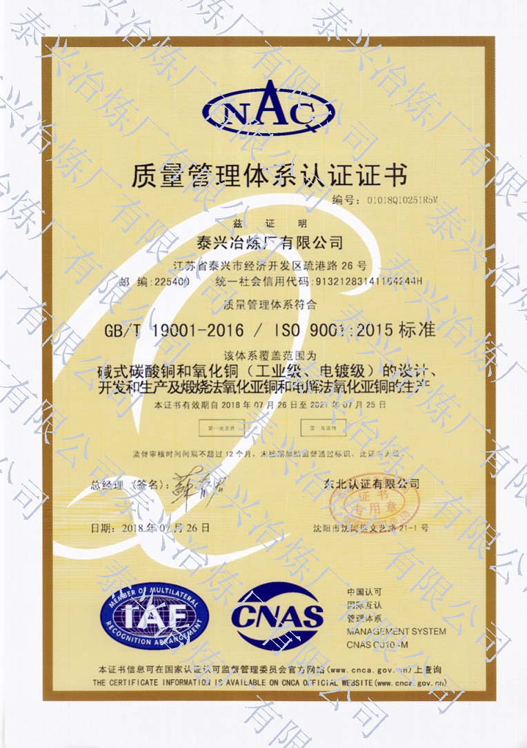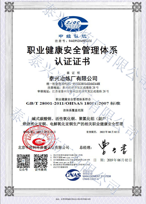 泰興冶煉廠有限公司(原泰興冶煉廠),始建于20世紀(jì)70年代初,現(xiàn)位于江蘇省泰興經(jīng)濟(jì)開(kāi)發(fā)區(qū)。歷經(jīng)40年的創(chuàng)新驅(qū)動(dòng)、穩(wěn)健發(fā)展,已成長(zhǎng)為一家專(zhuān)業(yè)生產(chǎn)堿式碳酸銅、高純電鍍氧化銅、氧化亞銅、氧化銅、無(wú)水硫酸銅、海綿銅粉及副產(chǎn)品聚氯化鋁(凈水劑)等系列無(wú)機(jī)鹽產(chǎn)品及處置不含氨的氯化銅蝕刻液(HW22)15000噸/年的“國(guó)家高新技術(shù)企業(yè)”和地方性骨干企業(yè)。公司總占地面積3.7萬(wàn)平方米,建筑面積4萬(wàn)平方米,注冊(cè)資本2088萬(wàn)元,固定資產(chǎn)1.2億元,年產(chǎn)值約7億元。